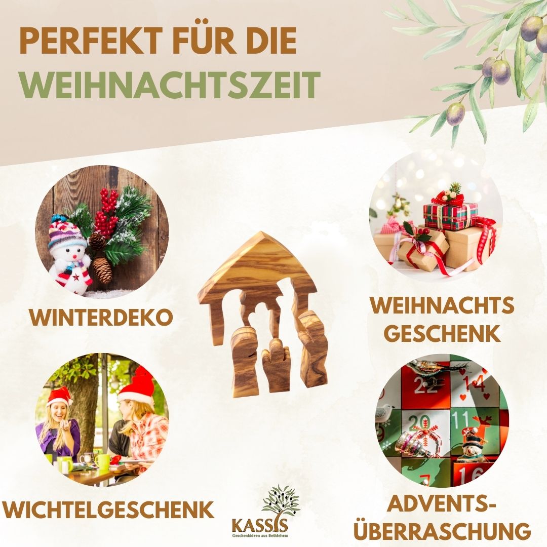 Eine kleine Holzkrippe besticht nicht nur durch ihre ästhetischen Vorzüge, sondern bringt auch zahlreiche praktische Vorteile mit sich. Holz ist ein natürliches, umweltfreundliches und nachhaltiges Material. Im Gegensatz zu Weihnachtsdekorationen aus Plastik oder anderen synthetischen Stoffen trägt eine Weihnachtskrippe aus Holz zur Reduzierung von Plastikabfällen bei und steht für ein verantwortungsbewussteres Konsumverhalten.