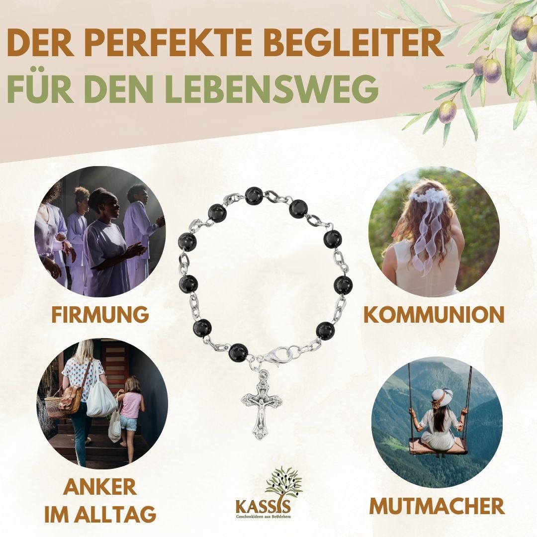 Jedes Armband wird in Bethlehem sorgfältig von Hand gefertigt. Die runden, polierten Hämatit-Perlen zeichnen sich durch ihren metallischen Glanz und ihre angenehme Haptik aus. Durch die präzise Verarbeitung entsteht ein harmonisches Schmuckstück, das Qualität und Spiritualität vereint.
