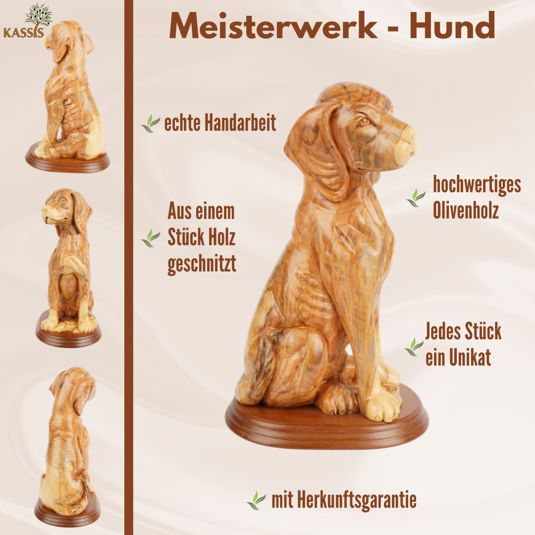 Der Hund – seit jeher ein Symbol für Treue, Schutz und Freundschaft – wird hier mit viel Gefühl und meisterlichem Können dargestellt. Die Figur ruht auf einem stabilen, dunkel gebeizten Sockel (nicht aus Olivenholz), der das Kunstwerk elegant abrundet.