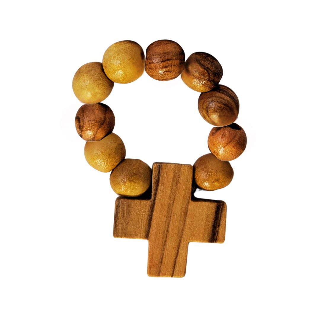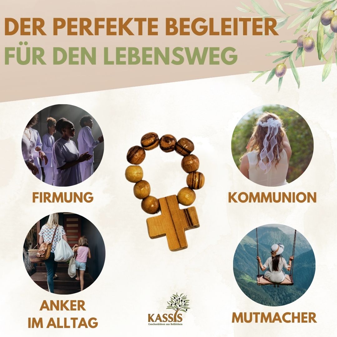 Ein starker Glaube braucht nicht viel Platz — mit diesem handgefertigten Fingerrosenkranz aus Olivenholz aus Bethlehem haben Sie Ihre Gebete immer bei sich. Kompakt, schlicht und voller Symbolkraft: Ein treuer Begleiter für unterwegs, der mehr ist als ein Gebetswerkzeug.