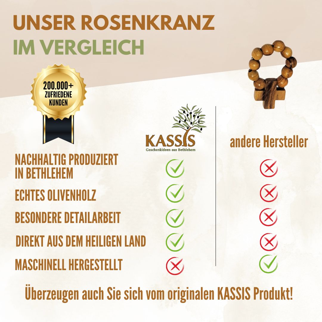 🌿 EIN STÜCK HEILIGES LAND IN IHREN HÄNDEN: Jeder Rosenkranz wird traditionell in Bethlehem gefertigt — der Geburtsstadt Jesu — von Kunsthandwerkern, die ihre Fertigkeiten über Generationen weitergeben. Durch das Olivenholz trägt der Rosenkranz nicht nur seine natürliche Schönheit, sondern auch die Verbundenheit mit der Heimat des Glaubens in sich.