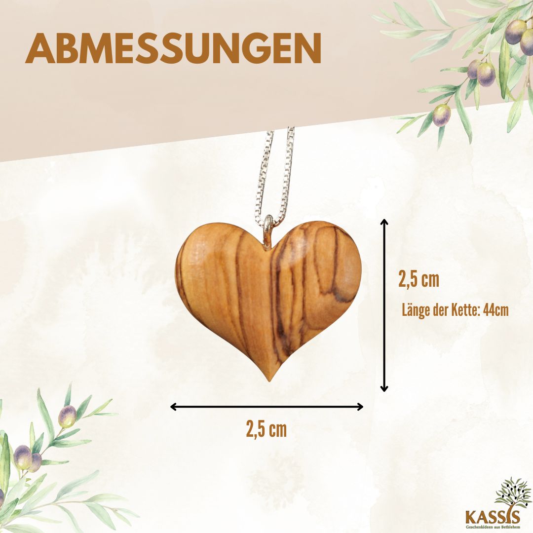Das Herz aus Olivenholz wurde in Bethlehem von Hand geschnitzt und fein bearbeitet. Es ist ein wunderschönes Geschenk, ein typisches Symbol von Zuneigung, benutzt als Schmuckstück oder Glücksbringer. Egal, ob Geburtstag, Valentinstag oder sonstige Familienfeierlichkeiten, die Halskette aus 925 Silber (nickelfrei) und das Herz mit individueller Maserung machen große Freude.
