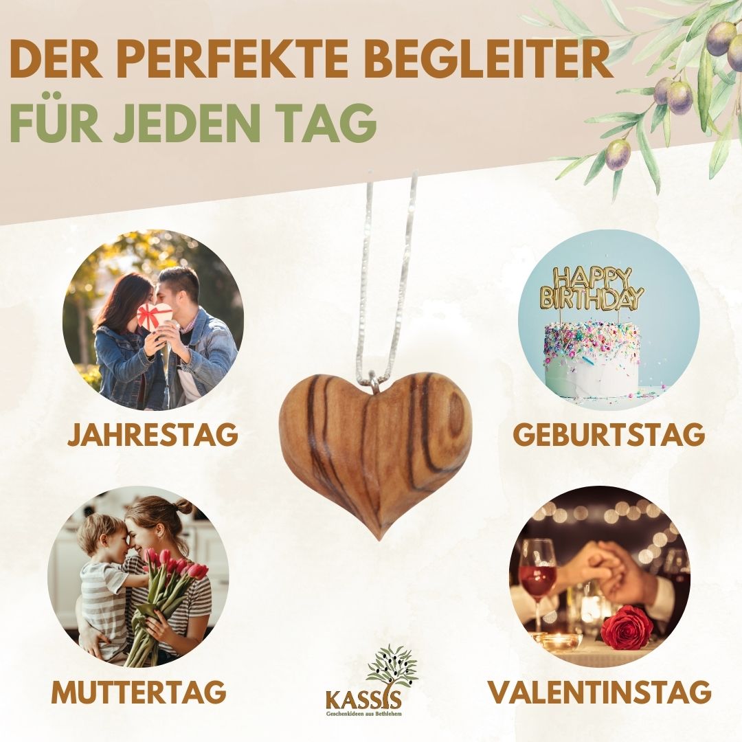 🌿EINE SCHÖNE; MODERNE UND EINZIGARTIGE Holzkette oder Christlichen Schmuck, die wirklich aus dem Heiligen Land stammt! Unser 3D Herz aus Olivenholz ist sowohl für traditionellen als auch für modernen Geschmack geeignet. Der fein bearbeitete Anhänger mit der silbernen Halskette ist kein einfacher Modeschmuck und glänzt für viele genauso edel, wie Gold, Edelstein oder ein Lebensbaum.