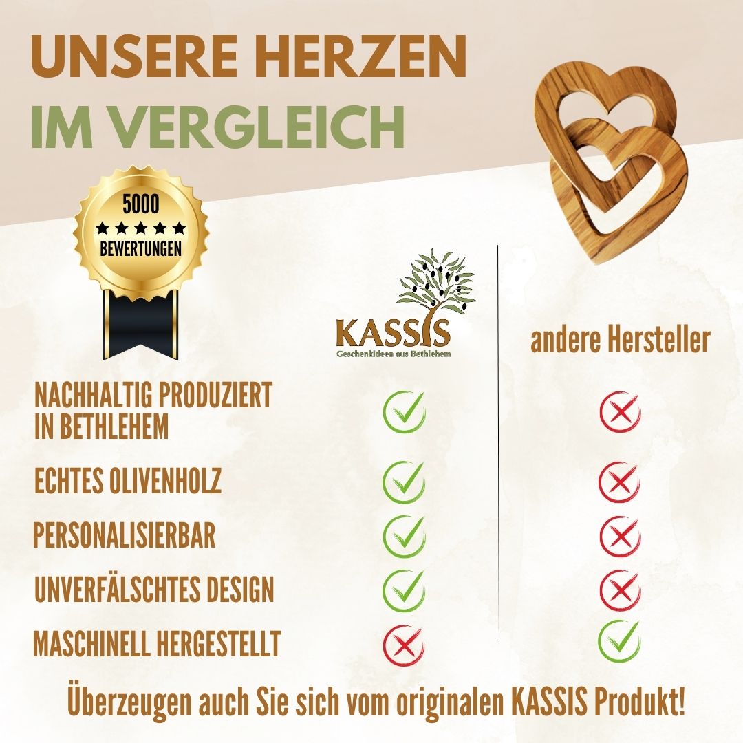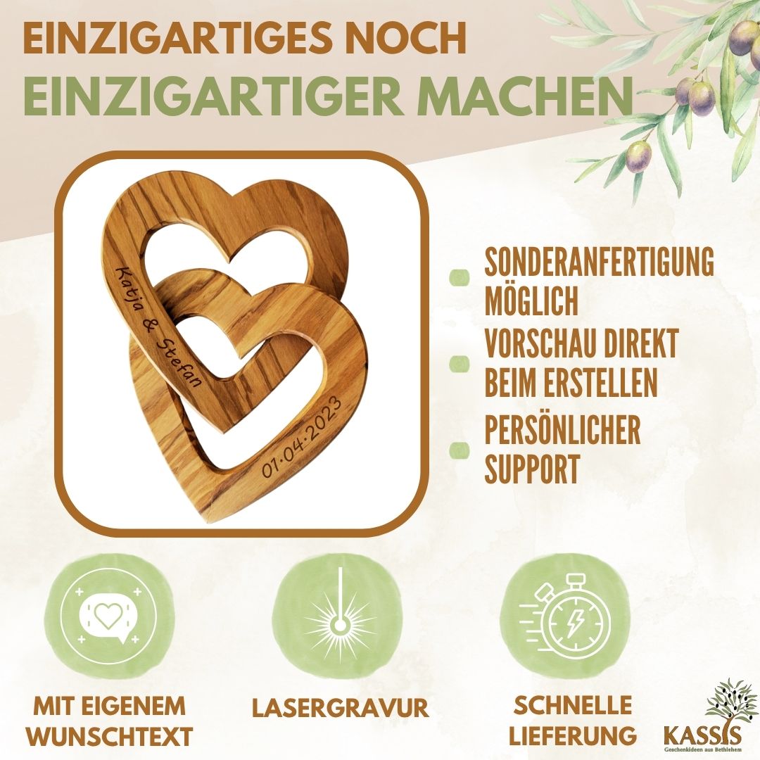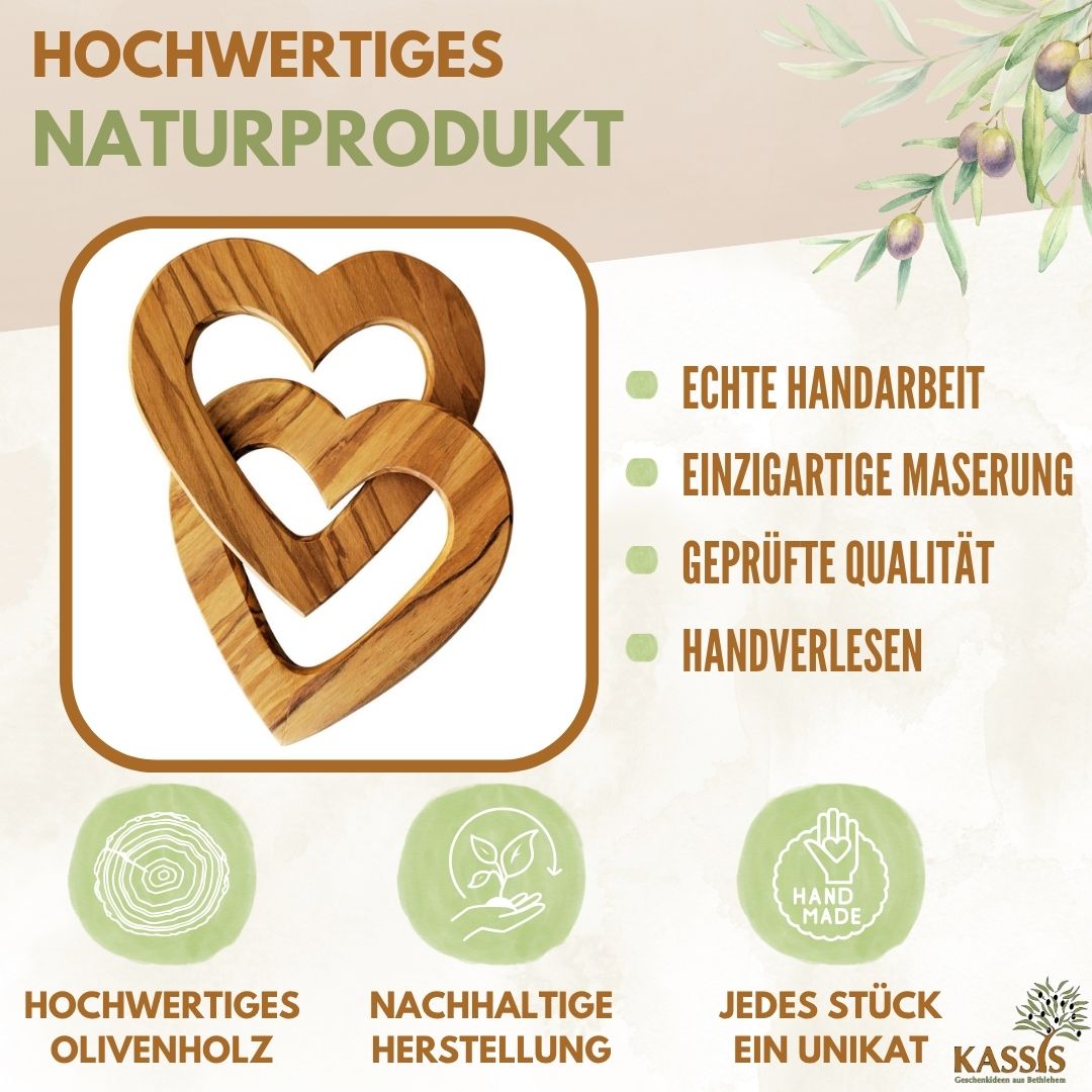 Tauchen Sie ein in die Handwerkskunst von Bethlehem mit unseren zauberhaften, handgefertigten Holzherzen. Jedes Herz erzählt eine Geschichte der Hingabe, denn es wurde mit Liebe gefertigt. Diese kunstvollen Verbindungen sind nicht nur eine Hommage an Romantik, sondern auch ein Symbol der Liebe und Verbundenheit. Ob zum Valentinstag, zur Hochzeit oder zur Silberhochzeit - diese meisterhaft gearbeiteten Holzherzen mit ihrer einzigartigen Maserung sind eine zeitlose Geschenkidee. Ihr schlichtes und dennoch elegantes Design fügt sich harmonisch in jeden Stil ein, sei es traditionell oder modern.