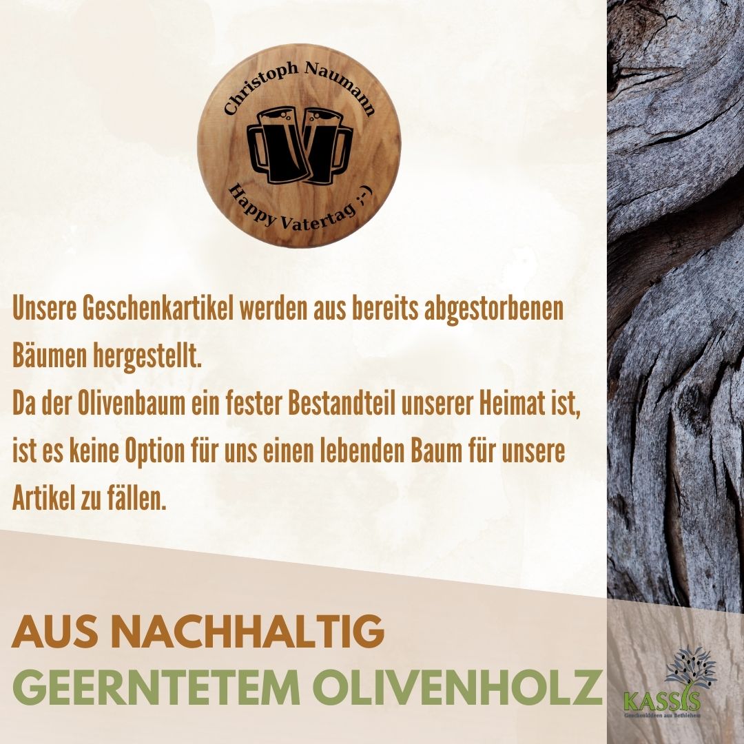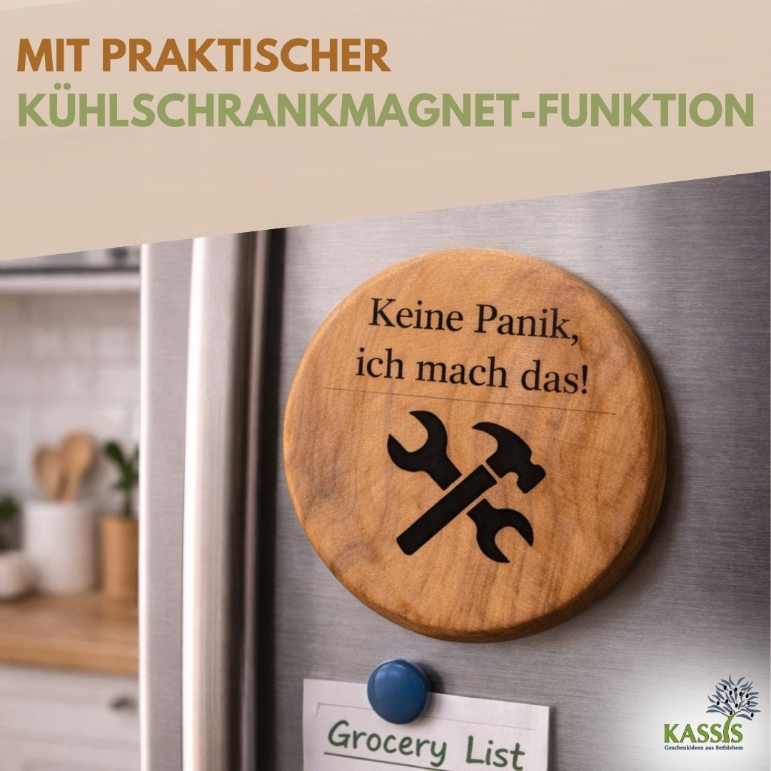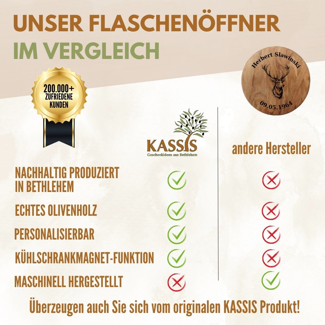 Gefertigt aus hochwertigem Olivenholz und in traditioneller Handarbeit in Bethlehem hergestellt, überzeugt jedes Stück durch seine einzigartige Maserung und warme Ausstrahlung. Durch die integrierte Magnetfunktion haftet der Flaschenöffner direkt am Kühlschrank und ist jederzeit griffbereit – ideal für den Alltag oder gesellige Momente.