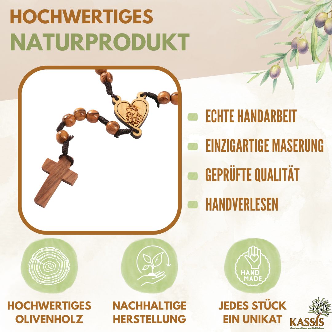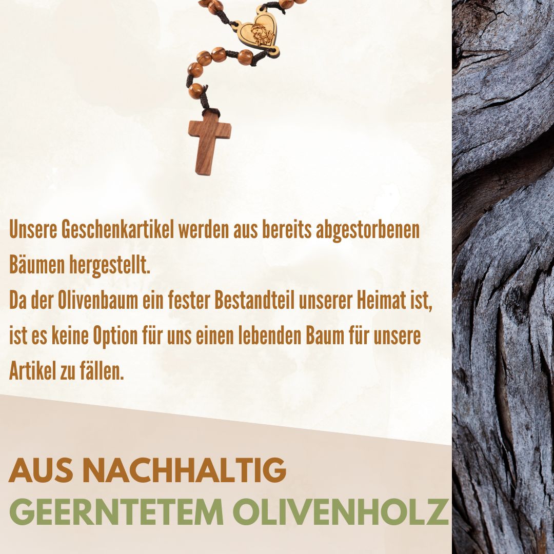 🌿NACHHALTIGES OLIVENHOLZ: Unsere Rosenkränze werden aus nachhaltig geerntetem Olivenholz aus Bethlehem handgefertigt, was zur Erhaltung der Umwelt beiträgt. Sie tragen die zeitlose Schönheit dieses Holzes und sind ein Statement für Nachhaltigkeit.