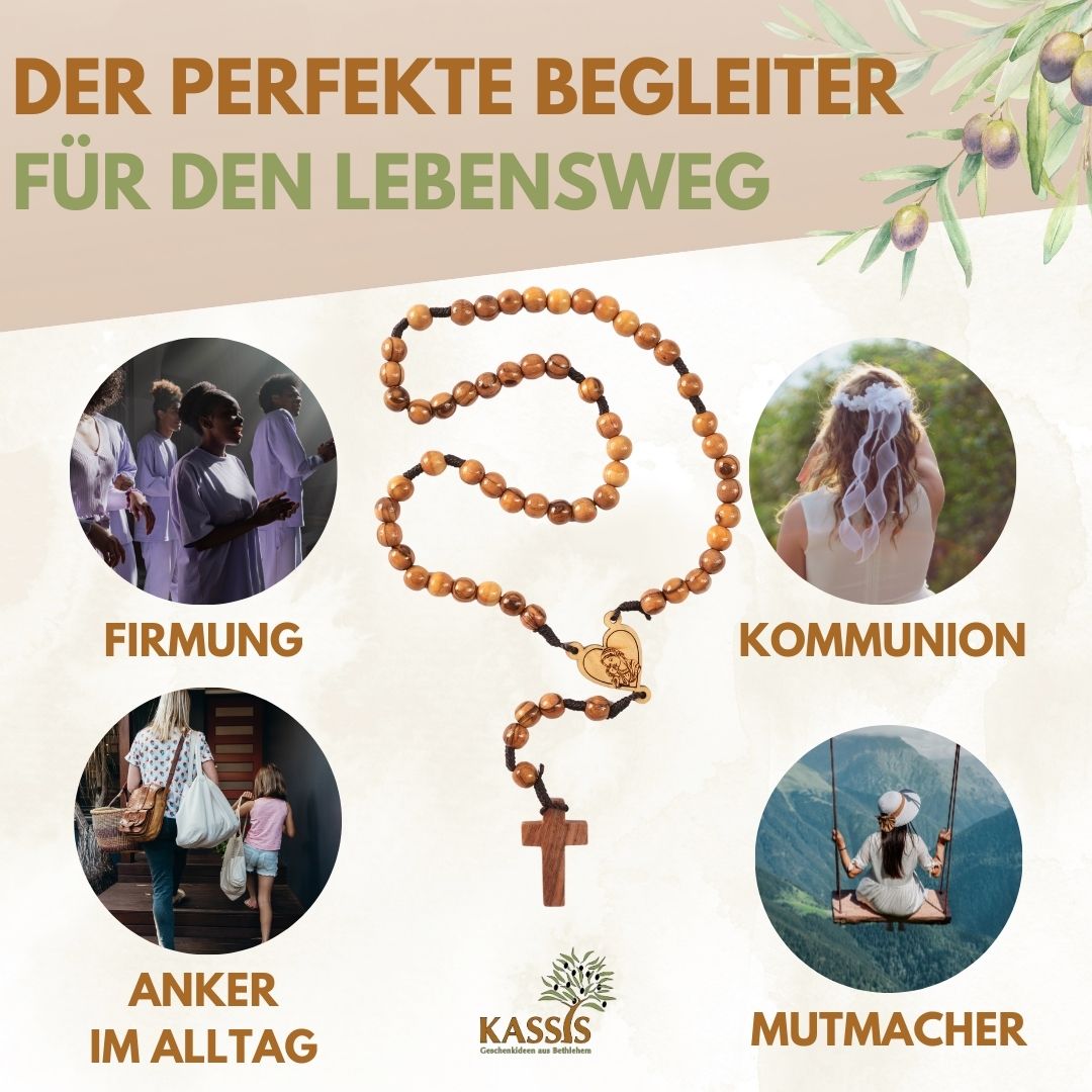 Der Rosenkranz aus Olivenholz wurde in Bethlehem von Hand geschnitzt und fein bearbeitet. Er ist ein wunderschönes Geschenk, ein typisches Symbol von Christentum, benutzt als Aufbewahrung, Glücksbringer, oder für innere Unterstützung. Egal, ob Geburt, Taufe, Erstkommunion oder Firmung, die Gebetskette mit individueller Maserung macht große Freude. Ihr schlichtes Design ist geeignet sowohl für traditionellen als auch für modernen Geschmack.