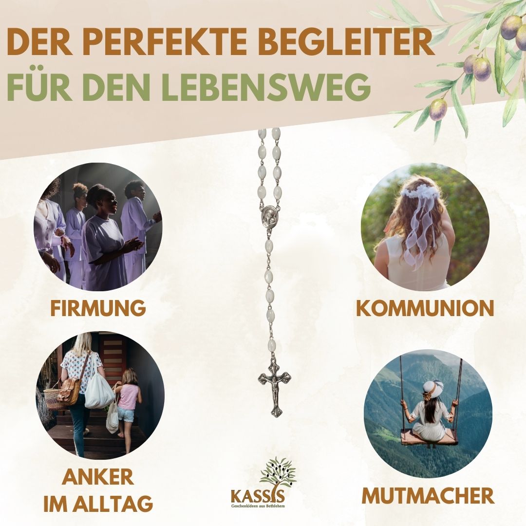 Der Rosenkranz mit Perlmutt wurde in Bethlehem von Hand gefertigt und fein bearbeitet. Er ist ein wunderschönes Geschenk, ein typisches Symbol von Christentum, benutzt als Aufbewahrung, Glücksbringer, oder für innere Unterstützung. Egal, ob Geburt, Taufe, Erstkommunion oder Firmung, die Gebetskette macht große Freude. Ihr schlichtes Design ist geeignet sowohl für traditionellen als auch für modernen Geschmack.