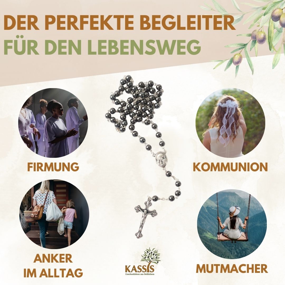 Der Rosenkranz mit Hämatit wurde in Bethlehem von Hand gefertigt und fein bearbeitet. Er ist ein wunderschönes Geschenk, ein typisches Symbol von Christentum, benutzt als Aufbewahrung, Glücksbringer, oder für innere Unterstützung. Egal, ob Geburt, Taufe, Erstkommunion oder Firmung, die Gebetskette macht große Freude. Ihr schlichtes Design ist geeignet sowohl für traditionellen als auch für modernen Geschmack.