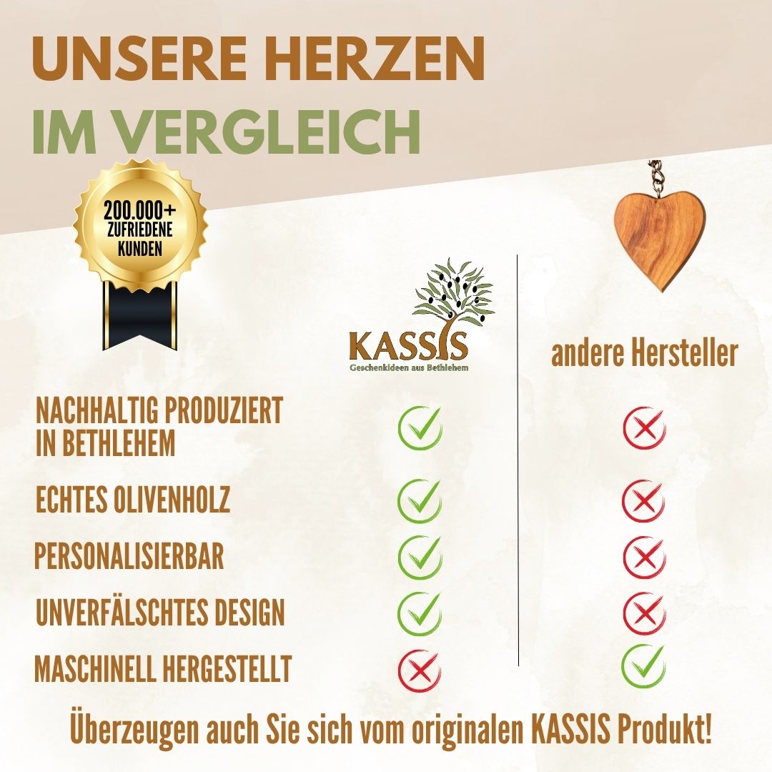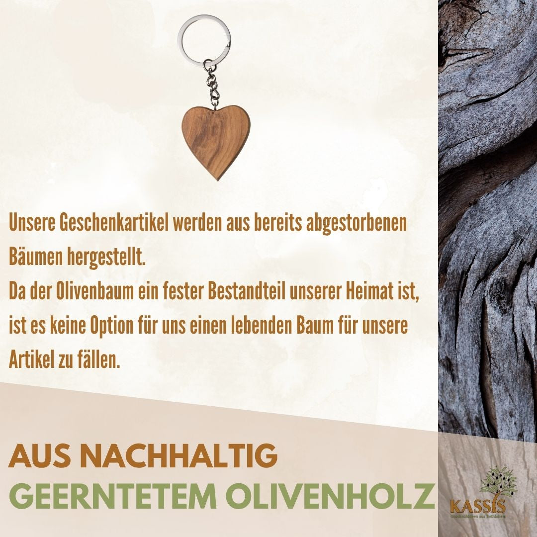 Jeder Schlüsselanhänger wird einzeln von Hand gefertigt und trägt die typische warme Maserung des Olivenholzes. Das macht jedes Herz einzigartig und besonders langlebig.
